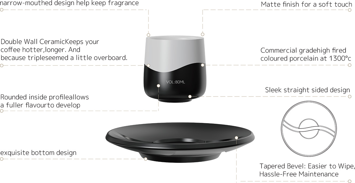 ◉Eye-Catching Two-Tone Premium Design: The unique contrasting two-tone finish adds a modern, sophisticated touch to your coffee setup, making it stand out in any home kitchen, specialty cafe or restaurant. The sleek straight-sided silhouette complements any decor style, from minimalist modern to warm rustic. ◉Double-Walled Insulation for Optimal Sipping Experience: Engineered with premium double wall ceramic construction, this cup locks in heat to keep your espresso, macchiato or tea hot for longer. Meanwhile, the outer wall stays consistently cool to the touch, eliminating scald risks and delivering a comfortable, secure grip with every sip. ◉Aroma-Locking & Flavor-Enhancing Structure: The narrow-mouthed design traps and preserves the rich, complex aroma of freshly brewed coffee, while the rounded inner profile creates optimal flow to unlock a fuller, more balanced flavor profile. The 80ml capacity is perfectly sized for espresso, coffee tasting and small-batch specialty brews. ◉Commercial-Grade Durable High-Fired Porcelain: Crafted with food-safe commercial-grade colored porcelain, fired at 1250-1300℃ high temperature for a dense, robust finish. The premium matte surface delivers a soft, non-slip grip, while being scratch-resistant, stain-resistant and built to withstand the rigors of daily home and high-volume commercial use. ◉Matching Saucer & Hassle-Free Maintenance: The set comes with a perfectly matched saucer with an exquisite stable base design, keeping your tabletop clean and your cup securely in place. The tapered bevel edge design is engineered for effortless wiping and cleaning, making daily maintenance completely hassle-free. ◉Versatile for All Scenarios & Gifting: Perfect for daily home use, office coffee breaks, specialty cafes, restaurants and tasting events. This set also makes a thoughtful, premium gift for coffee enthusiasts, home baristas and anyone who appreciates a beautifully crafted coffee experience.