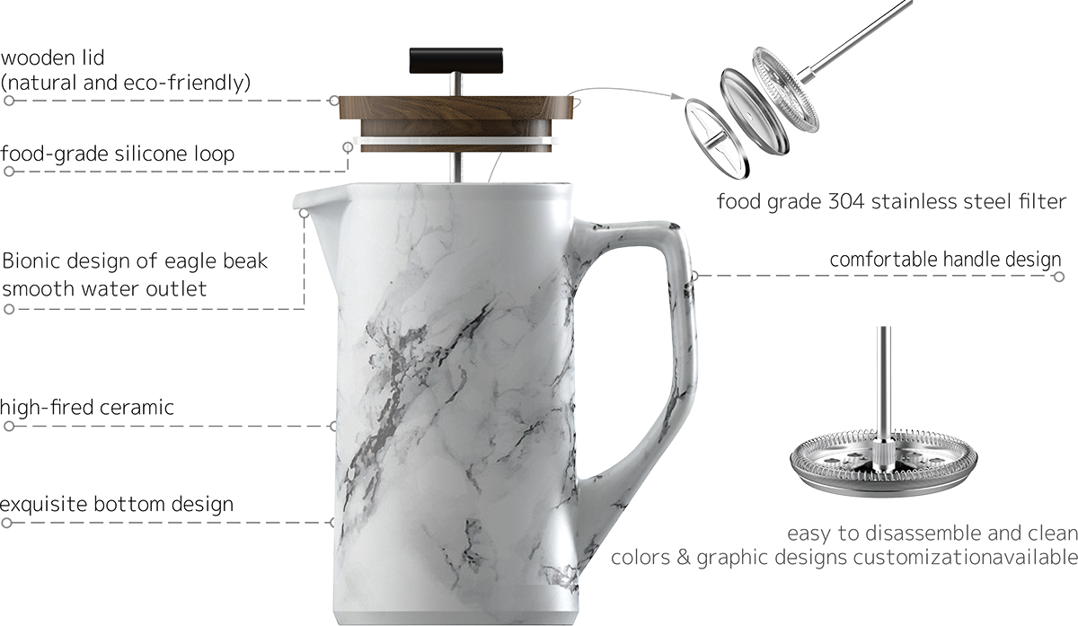 Introducing the DHPO Ceramic French Press, a stylish and efficient coffee brewing device. Made from high-quality ceramic materials with marble texture, which makes it very special. This French Press offers a unique brewing experience with its sleek design and excellent heat retention properties.